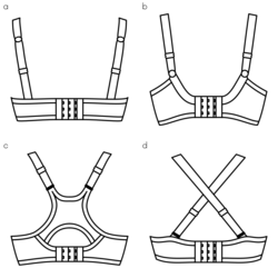 The straps of a convertible bra can be fastened in a criss-cross arrangement, either to keep them from showing under clothing, or to stop them slipping. A J-hook bra has non-detachable straps, each having an additional slider with a hook that allows them to be clipped together. Although the straps do not cross, they are nevertheless pulled in at the back, like a racerback, yielding similar benefits. There are also separate bra strap clips that achieve the same effect, which can be used with any bra that has long enough straps.
