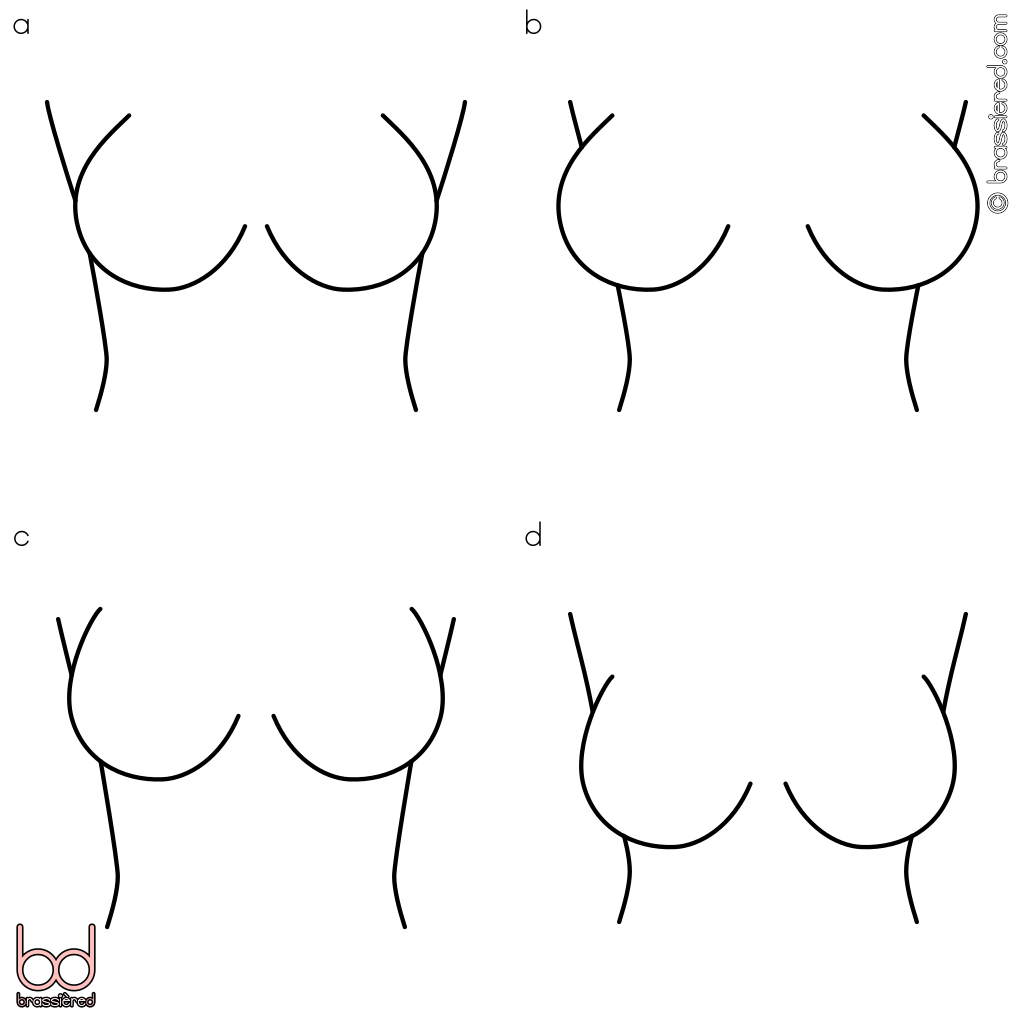Depending on the amount of space between them, breasts may described as either close-set or wide-set. Close-set breasts, also known as narrowly spaced breasts, have less of a gap, and may even meet in the middle of the chest. There may be correspondingly more space between the outer edges of the breasts and the sides of the body. For the gore of a bra to sit where it should without pinching such breasts, it should be narrower, shorter and lower, as is the case with a plunge bra. Wide-set breasts, also known as widely spaced or side-set breasts, are the opposite. Although it is harder to emphasise the cleavage with wider set breasts, a plunge style can nevertheless help make them appear closer together. Front-closure bras are more suitable for wide-set breasts, whereas styles with wider, higher gores such as balconette bras also work better. With wide-set breasts, the nipples may point to the sides rather than forward, in which case, the breasts are said to be outward facing or East-West breasts. These benefit from bras that offer more in the way of side support.