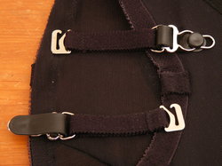 Fortunately, such sewing is far easier when the girdle isn't already fastened - a couple of minutes with a sewing machine is all it takes to add the loops to allow such a garment to be locked. Although it may be tempting to unpick some of the existing stitching in order to integrate such additions more fully, as one might when making a lockable bra, it's worth bearing in mind that this area will be under significant strain when worn. Moreover, as illustrated in Figure 13, sturdier girdles have a surprising amount of structure to them - quite apart from the more obvious metalwork, the darker strip to the top of the photograph conceals a stiff bone which thwarts sewing where one might first consider.