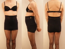 Secondly, there's an unladylike bulge in my husband's thong, caused by how such skimpy underwear does little to suppress his manhood - even before he becomes erect! Despite wearing his panties under his suspender belt as befits a submissive man, it is still all too easy for my husband to gain access to what's underneath, with the stretchy fabric that fails to flatten his crotch capable of being pulled down without him even having to unfasten his stockings! Moreover, while the lines of black elastic are a pleasing sight on my husband's pert posterior, such narrow straps would do nothing to shape his buttocks were his flesh more flabby. Again, a more substantial garment is called for - a good, old-fashioned girdle!